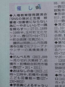 2026年2月26日 / 最終更新日 : 2026年2月26日 shingetsuin info 玉村町 明日、玉村町での人権教育啓発講演会、 上毛新聞に掲載していただきました。 みなさまのご来場をお待ちしております。 照諦山 心月院 尋清寺 住職 髙橋 美清